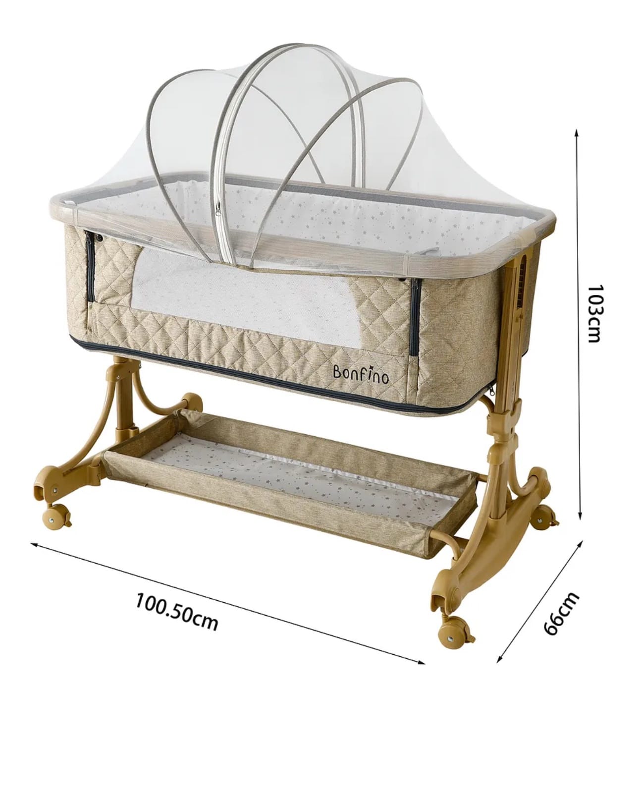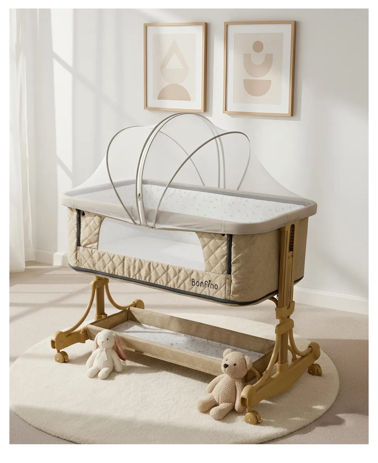 Designed for comfort, safety, and effortless newborn care, the Bonfino 3-in-1 Bassinet is a beautifully crafted solution for your baby’s early months. Thoughtfully designed to grow with your newborn, it seamlessly functions as a standalone bassinet, a bedside sleeper, and a gentle rocking cradle — all in one elegant setup.