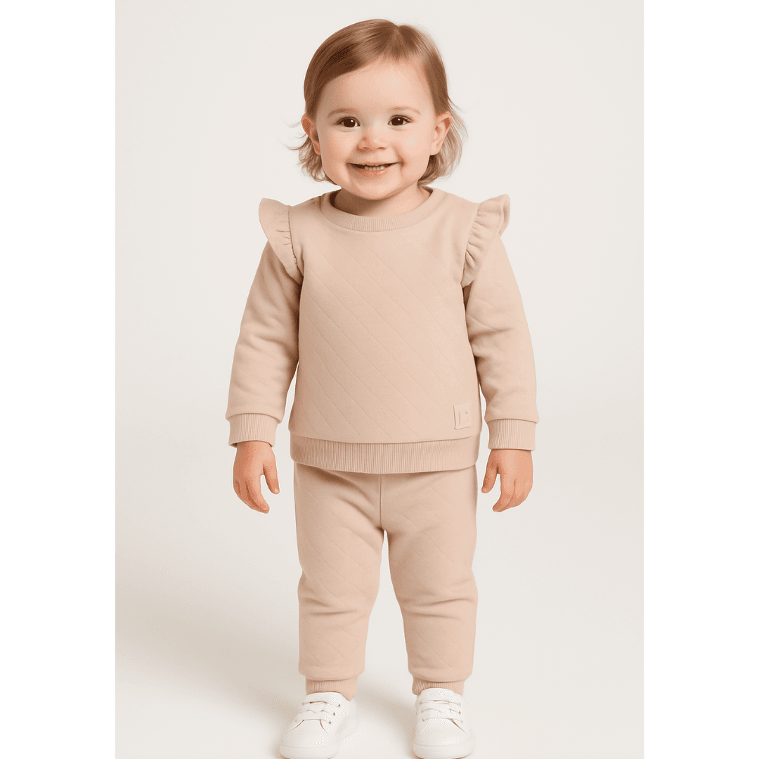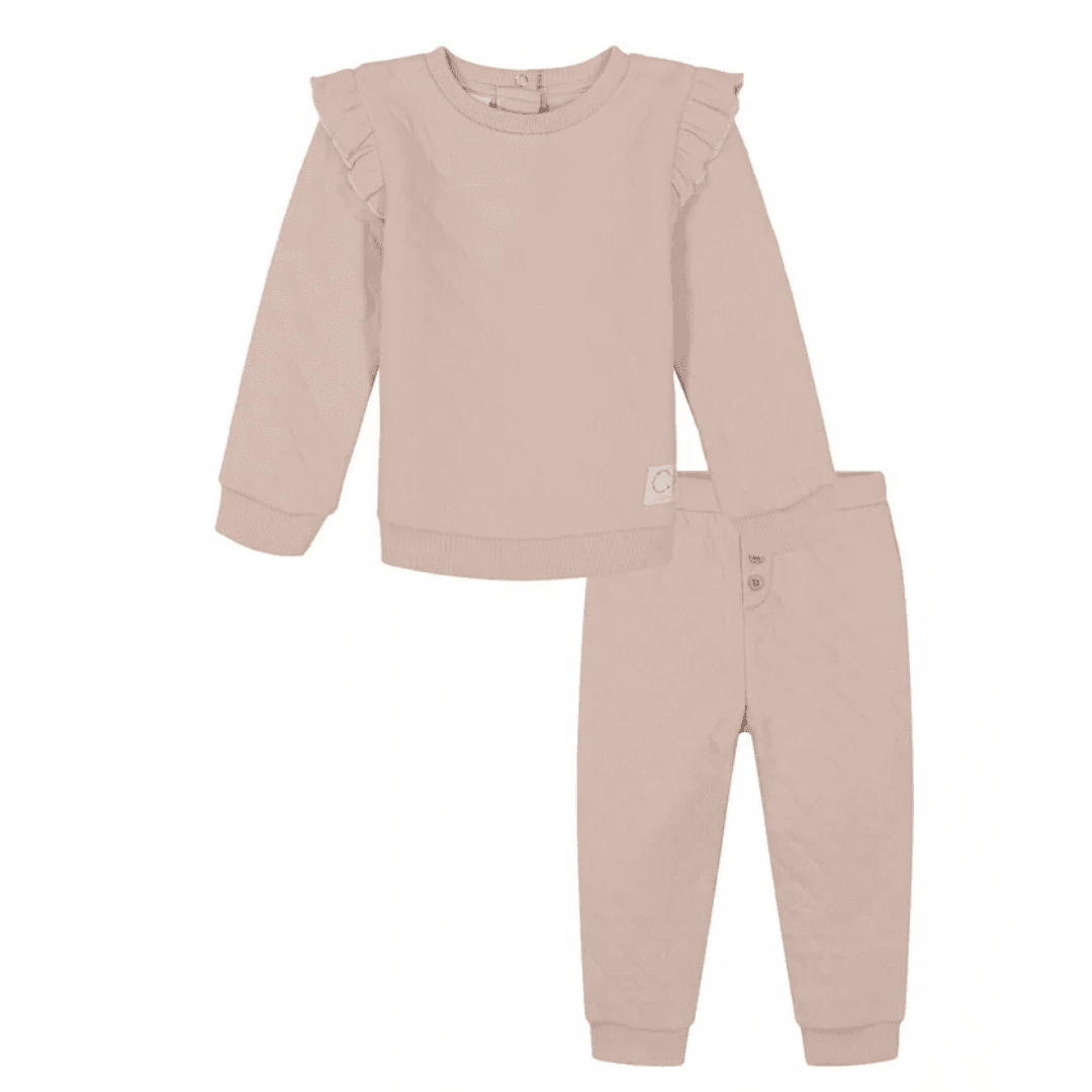 Soft and plush quilted double-knit fabric adds comfort to sweet dressing from, featuring a crewneck with ribbed-trim bertha collar and easy joggers for every day.
