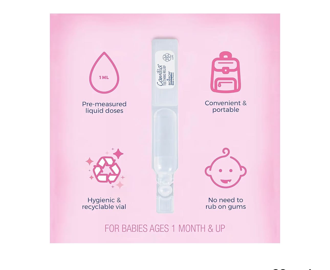Made with plant-based active ingredients, Camilia is alcohol-free, dye-free, and preservative-free, making it safe even for newborns. The single-dose vials are hygienic, mess-free, and perfect for both daytime and nighttime teething relief.