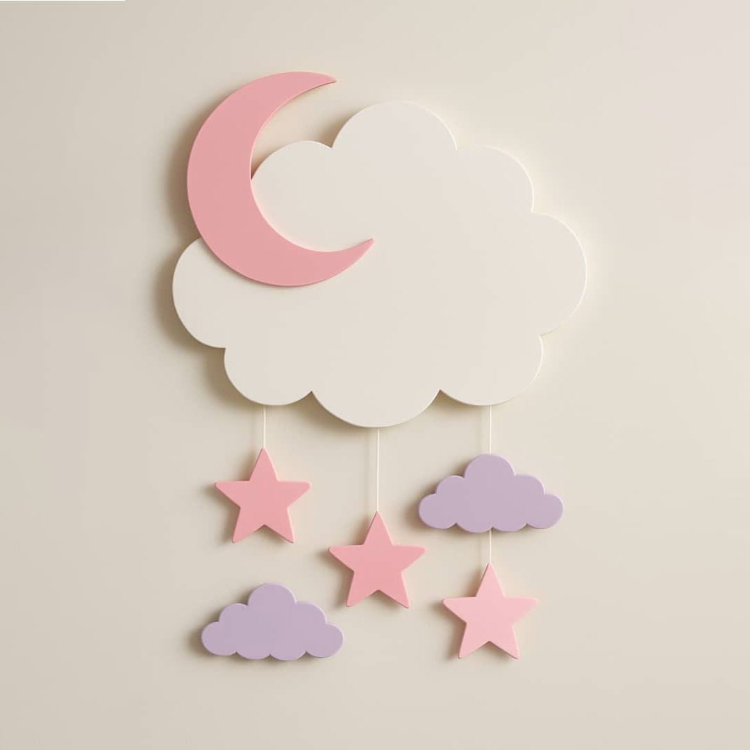 - Design and Materials: The main elements are a large, white cloud shape and a pink crescent moon. Hanging from the cloud are soft, decorative pieces shaped like stars and smaller clouds. The materials appear to be made of painted wood or a dense, durable foam, giving it a high-quality, handcrafted look.