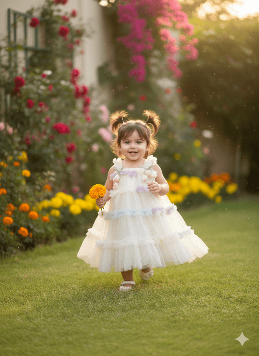 A beautifully layered net dress designed to make your little one look straight out of a fairytale. Crafted with soft, airy net fabric, this dress features delicate pastel flower detailing along the neckline and tiered layers for an elegant, whimsical touch.