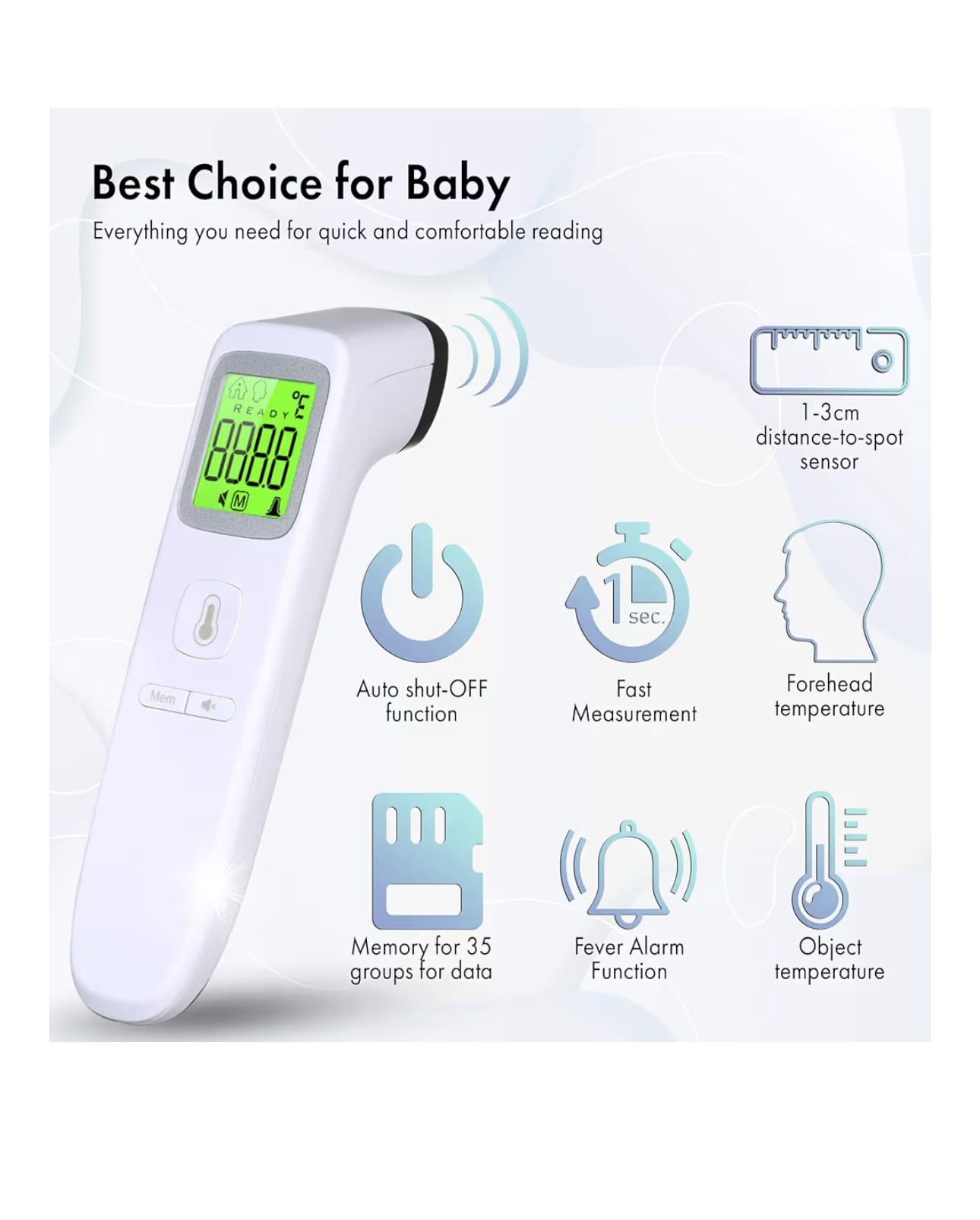 With simple one-touch operation and a clear backlit display, this thermometer is easy to use both day and night. Its hygienic, non-invasive design helps reduce the spread of germs, while memory recall allows you to track previous readings for better monitoring.